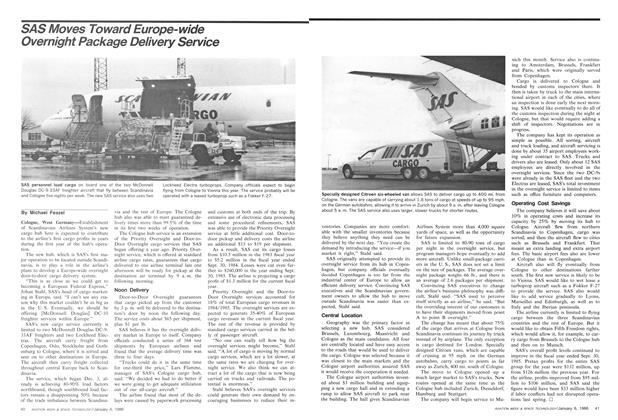 Cologne, West Germany—Establishment of Scandinavian Airlines System’s new cargo hub here is expected to contribute to the airline’s first cargo profits in years during the first year of the hub's operation. The new hub, which is SAS’s first major operation to be located outside Scandinavia, is to play a role in the airline’s plans to develop a Europe-wide overnight door-to-door cargo delivery system.