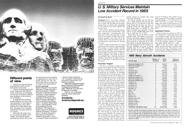 Washington—U. S. Air Force achieved the lowest aircraft accident rate in its history in 1985, with the other services maintaining Class A accident rates comparable to the relatively low levels achieved the previous year. The trend in military aircraft accident rates since the end of World War 2 has been downward.