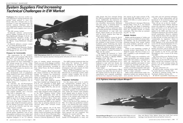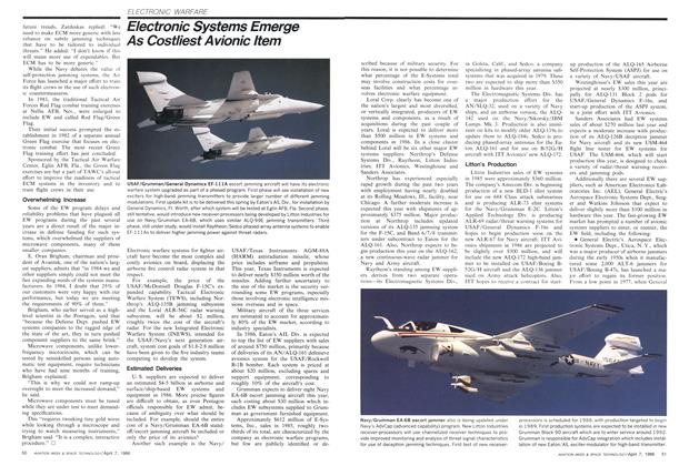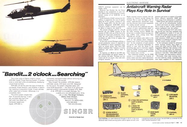 Electronic warfare systems for fighter aircraft have become the most complex and costly avionics on board, displacing the airborne fire control radar system in that respect. For example, the price of the USAF/McDonnell Douglas F-15C’s expanded capability Tactical Electronic Warfare System (TEWS), including Northrop’s ALQ-135B jamming subsystem and the Loral ALR-56C radar warning subsystem, will be about $2 million, roughly twice the cost of the aircraft’s radar.