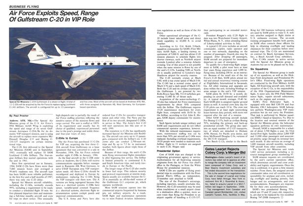 Andrews AFB, Md.—The Special Air Missions group of the U. S. Air Force’s 89th Military Airlift Wing is exploiting the speed and range of its seven Gulfstream Aerospace C-20A/Bs for its domestic VIP transport mission, and is using the aircraft to replace more expensive McDonnell Douglas C-9 and Boeing C-135/137 transports on certain international trips.