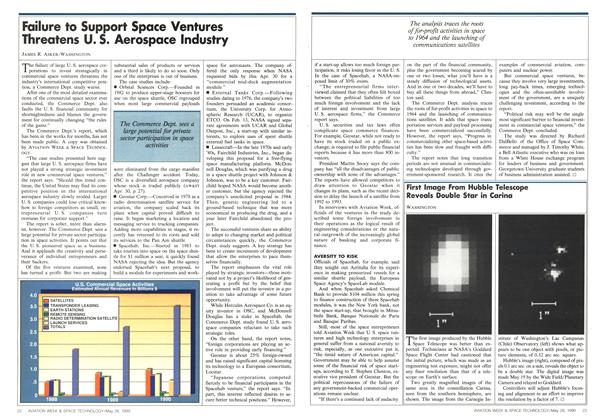 WASHINGTON The failure of large U. S. aerospace corporations to invest strategically in commercial space ventures threatens the industry’s international competitive position, a Commerce Dept, study warns. After one of the most detailed examinations of the commercial space sector ever conducted, the Commerce Dept. also faults the U. S. financial community for shortsightedness and blames the government for continually changing “the rules of the game.”