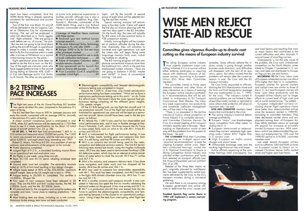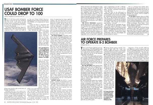 LANGLEY AFB, VA. The U. S. Air Force, which will take delivery of the first B-2 from Northrop later this month, could reduce its total bomber force, including B-1s and B-52s, to as low as 100 deployable aircraft by the end of the decade. Air Force Chief of Staff Gen. Merrill A. McPeak said, "We have a balancing act underway here in which we have to phase over time the right combination of bomber capabilities."