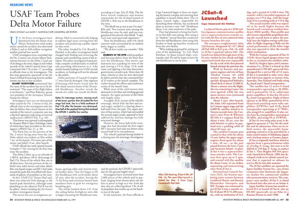 Cape Canaveral Air Station Lockheed Martin placed a $100-million Japanese communications satellite into a supersynchronous transfer orbit with the first of nine planned Atlas booster launches this year. The aerospace conglomerate’s Atlas 2AS booster, designated AC-127, lifted off Pad 36B at 8:42 p.m., Feb. 16, with its JCSat-4 payload (photo left).