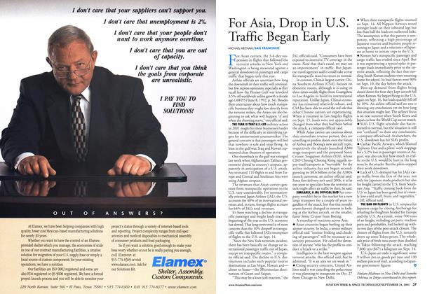 SAN FRANCISCO For Asian carriers, the 3-4-day suspension in flights that followed the terrorist attacks in New York and Washington is being measured against a general slowdown in passenger and cargo traffic that began early this year. Airline officials are uncertain how long the downdraft in their traffic will continue, but few express optimism, especially as they recall how the Persian Gulf war knocked 3.5% off worldwide airline growth a decade ago (AW&ST June 8, 1992, p. 34).