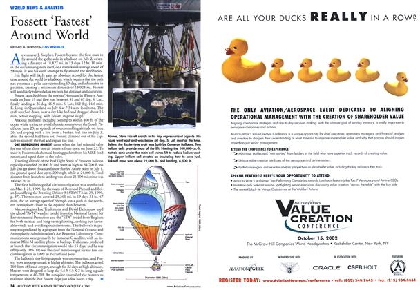 LOS ANGELES Adventurer J. Stephen Fossett became the first man to fly around the globe solo in a balloon on July 2, covering a distance of 18,827 mi. in 13 days 12 hr. 10 min. in the circumnavigation itself, or a remarkable average speed of 58 mph.