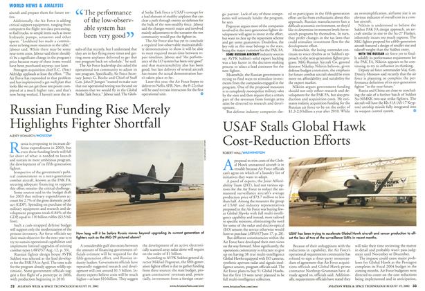 MOSCOW Russia is proposing to increase defense expenditures in 2003, but even these funding levels will fall far short of what is needed to launch and sustain its most ambitious program, the development of its fifth-generation fighter. Irrespective of the government’s political commitment to a next-generation combat aircraft, known as the PAK FA, securing adequate financing to support this effort remains the critical challenge.
