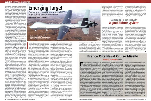 PARIS France will join a select group of nations, including the U.S. and Russia, that possess a home-grown naval cruise missile capability, following issuance of a full-scale development contract last week. The naval weapon, derived from the Scalp/Storm Shadow air-launched cruise missile developed by MBDA for France and the U.K., will be in the 1,000-km.-plus class, permitting high-precision, deep-penetration strikes against land targets.