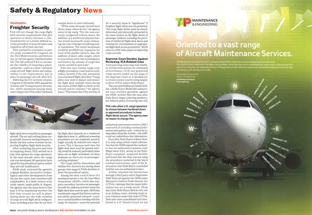 FAA will not change the cargo flight deck security requirements that give operators a choice between a reinforced barrier or a clearly defined security procedure to keep intruders and explosives off of their aircraft. FAA reached its conclusion as part of a study mandated by Congress via the FAA Modernization and Reform Act, or current agency reauthorization bill.